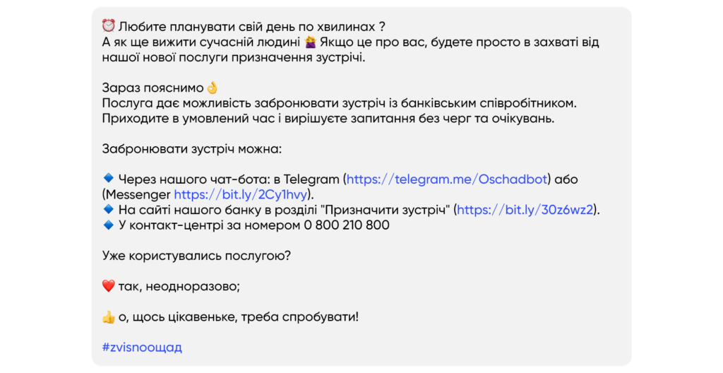 This innovation allows you to make an appointment at the bank simply through a chatbot in Telegram, Messenger, the web version of the site, or the contact center. Agree, it is much more convenient than wasting time in a physical queue!