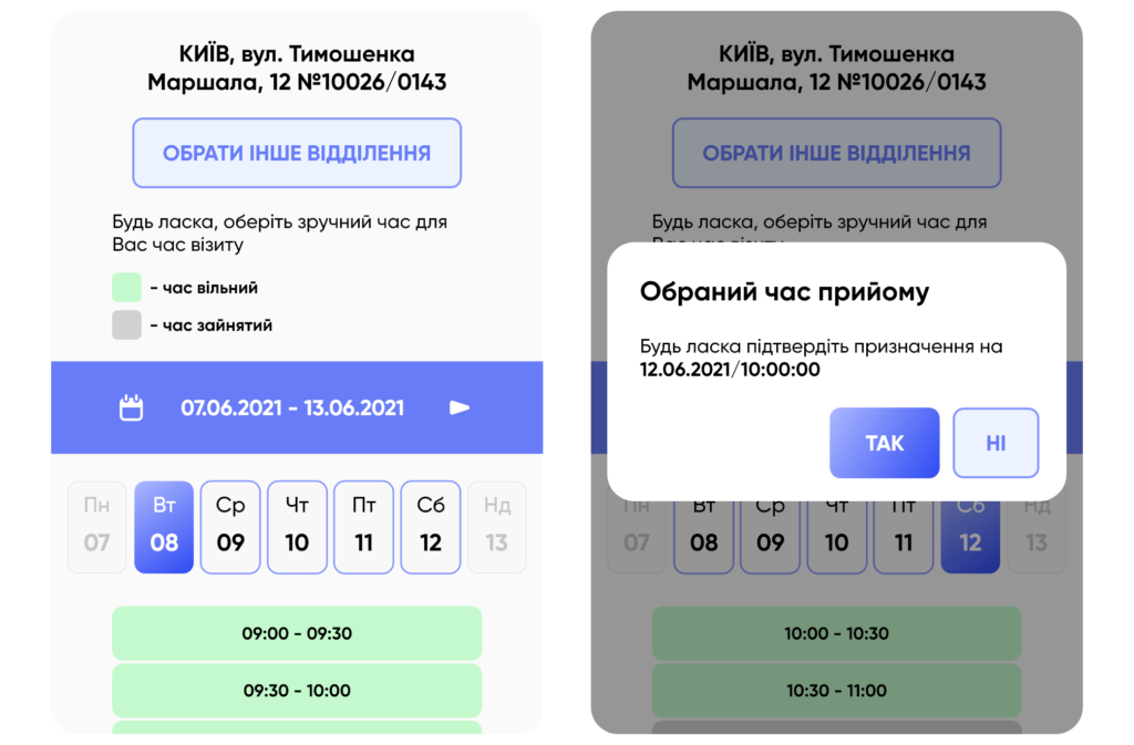After confirmation, you can choose the date and convenient time for your visit. If the desired time is not available at the selected branch, you can change the branch.
