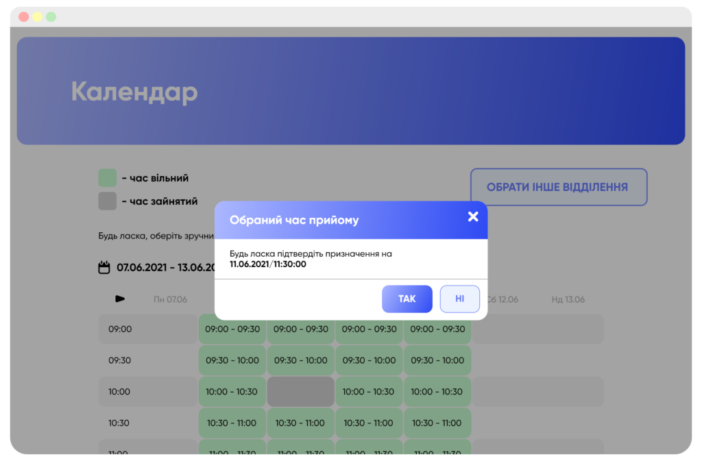После подтверждения откроется выбор даты и свободное для записи время. Вы всегда можете изменить отделение, если в нужном нет подходящего для вас времени.